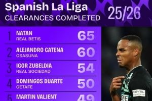 西甲解围次数排行:贝蒂斯后卫纳坦65次居首,祖贝迪亚54次第三